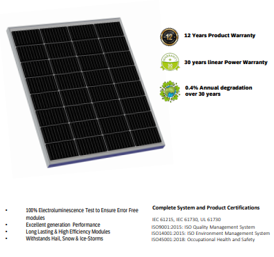 Mono Crystalline PERC PV Module RN1-24S120M16P10B12V 120Wp/12V. • 100% Electroluminescence Test to Ensure Error Free modules • Excellent generation Performance • Long Lasting & High Efficiency Modules • Withstands Hail, Snow & Ice-Storms